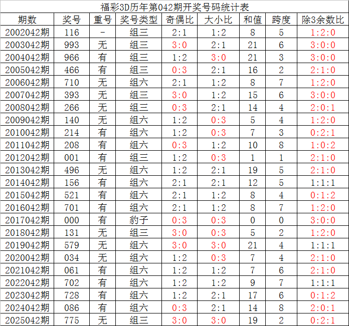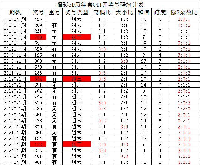 其中,豹子号码出现1次,组三号码开出9次,组六号码出现14次,组六号码目前连续1年没有出现,本期今年同期看好开出组六号码。